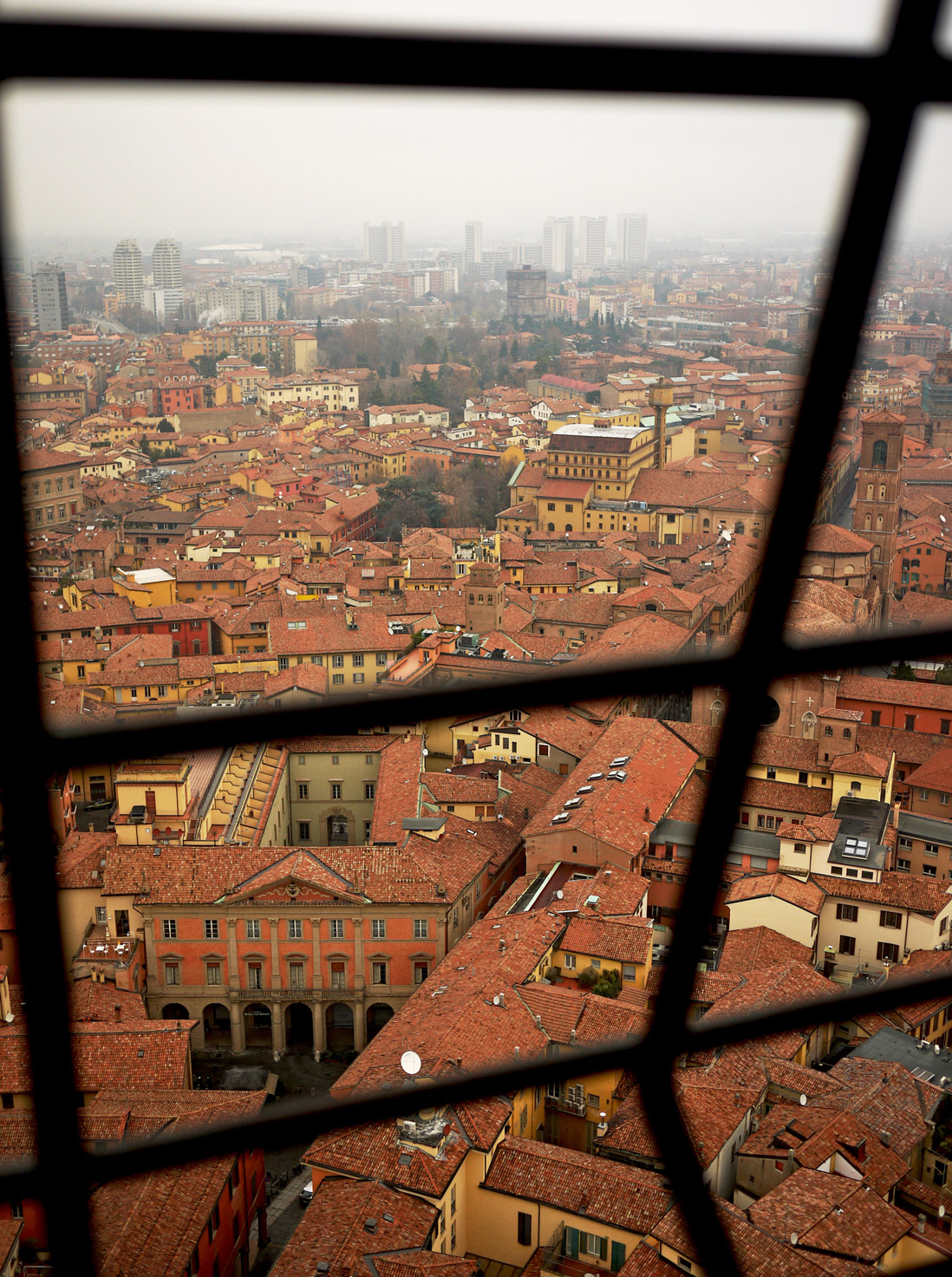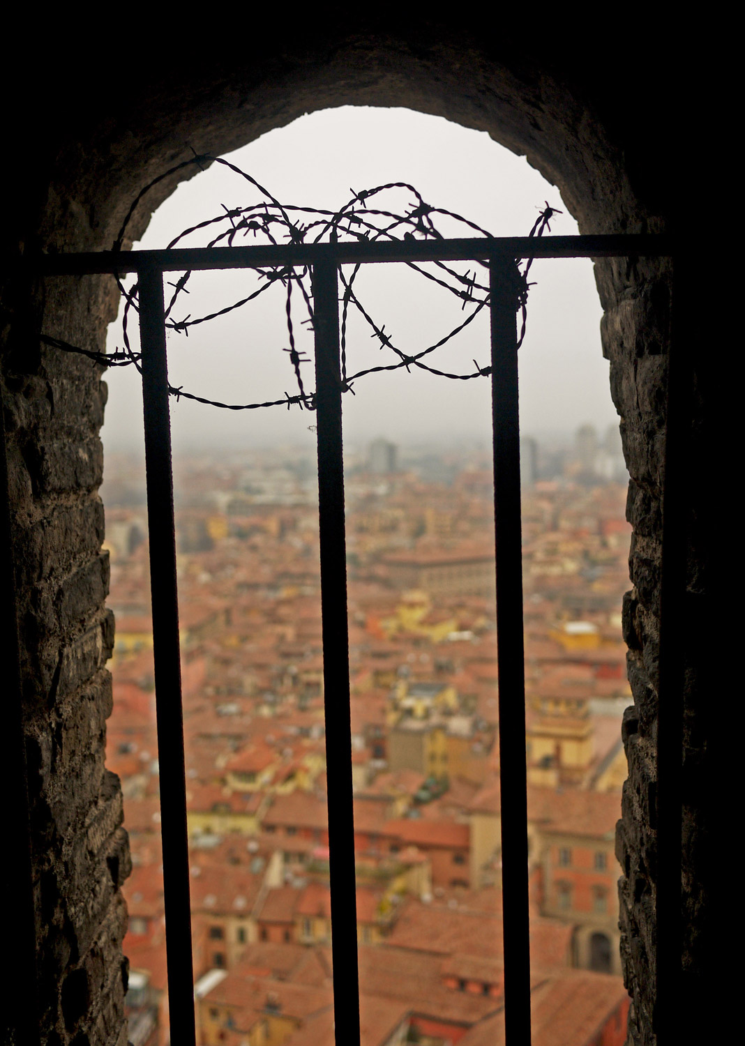 The Asinelli Tower is 97 meters and was built by the Asinelli family in 1109 and yes, you can climb up (498 steps to be exact). But only climb up by feet. I climbed up the Duomo in Milan and I recall it wasn’t as narrow and scary as the Asinelli. The tower was once used as a prison and you can find some remnants of that period here and there. It’s very narrow and high. It takes about 10 minutes to go up, but may take longer if there are more people because you have to wait your turn if you meet anybody in the middle. The Asinelli is also a bit tilted, but you can’t really tell, which was a good thing for me because I was already a bit nervous of walking up anyway.
