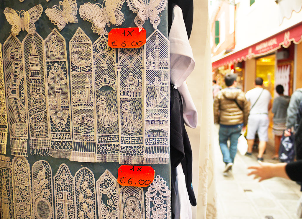 One thing I noticed when I was traveling around Venice, Rimini and other cities were lace everything. Lace shorts, lace shirts, lace bikinis (appropriate ones) lace shoes, lace bracelets, lace bags, lace everything. I hadn’t really noticed this last year when I was in Italy, so either I was a bit ignorant or lace is big at the moment. And if it’s big, either for the moment or in anyone’s fashion life, Burano is the place to be. Burano is the neighboring island of Murano and although it’s hard not to notice the colorful houses lined up on the canals, it’s actually historically famous for its lace and lacemaking. The history goes way back to the 1500s. The famous Burano lace was first produced by nuns and gradually made up it way to the daily routines of the wives of many fishermen who lived on the island.