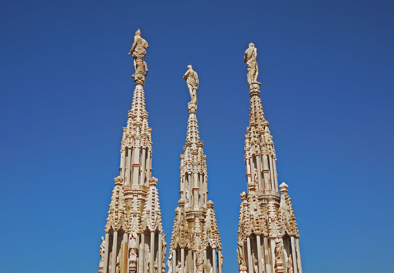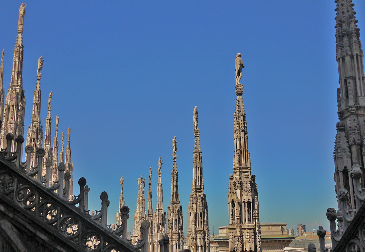 디자인 측면에서는 바티칸 못지 않게 화려하고 아름다운 밀라노의 두오모. 1386년에 공사가 시작되었지만 완공은 60년이 지난 후. 이탈리아에서 가장 큰 성당으로 알려져 있고 성당 전체를 장식하는 장식물들의 수는 무려 3,100-3,500개, 세계에서 가장 많은 수를 자랑한다. 현재 130명의 직원들이 일하고 있으며 처음에는 벽돌로 공사가 시작되었지만 후에 대리석으로 업그레이드 되었다. 성당 꼭대기에 있응 금색 마리아 장식은 종교적으로, 문화적으로 그리고 역사적으로 중요한 유물이라 어떤 건물도 이 작은 마리아보다 높을 수 없도록 법으로 지정했다고.