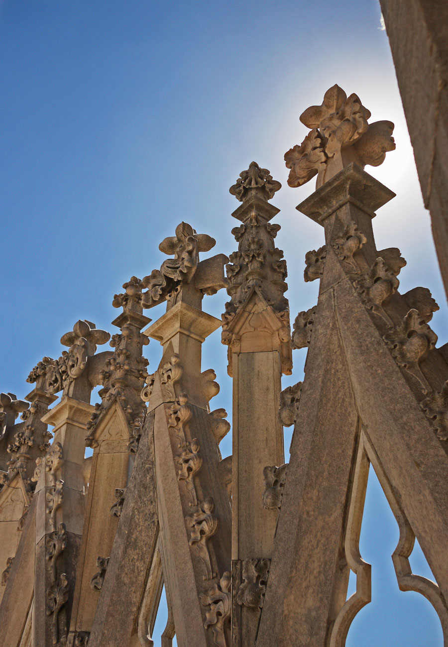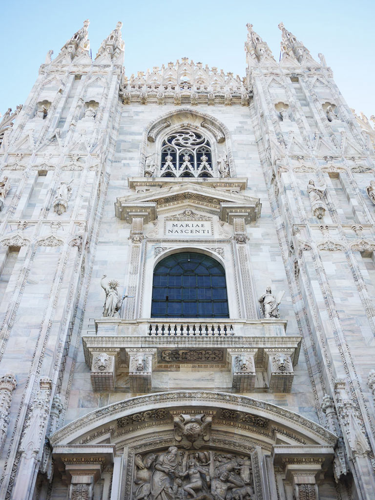 “The central one of its five great doors is bordered with a bas-relief of birds and fruits and beasts and insects, which have been so ingeniously carved out of the marble that they seem like living creatures– and the figures are so numerous and the design so complex, that one might study it a week without exhausting its interest…everywhere that a niche or a perch can be found about the enormous building, from summit to base, there is a marble statue , and every statue is a study in itself…”