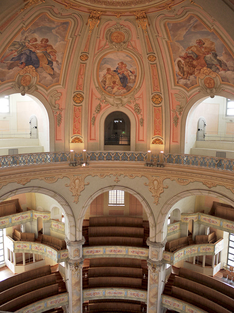 지금까지 가본 성당 중에서는 가장 여성스러웠던 성당 Frauenkirche. 유럽에서는 가장 큰 돔형 성당이다. 들어가자마자 핑크빛의 향연. 드레스덴의 다른 건물들과 마찬가지로 2차세계대전때 파괴되었다가 2005년에 재건되었다.