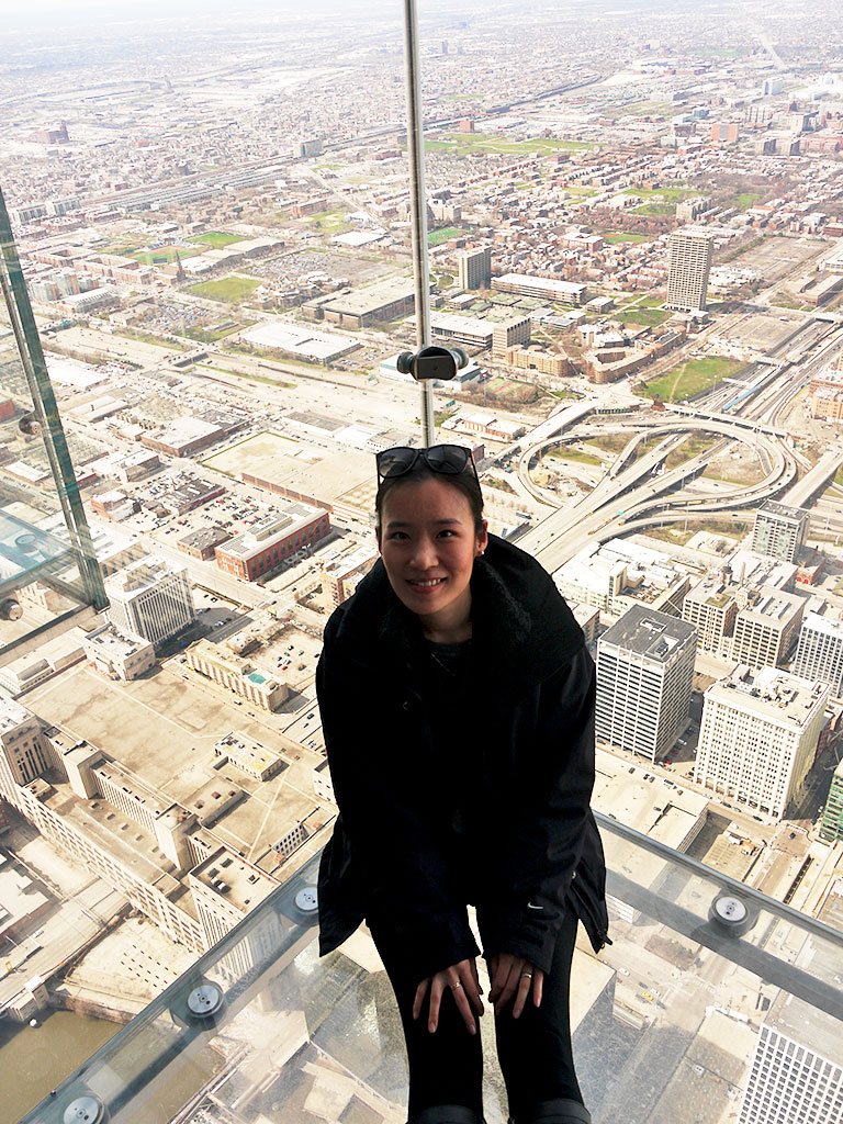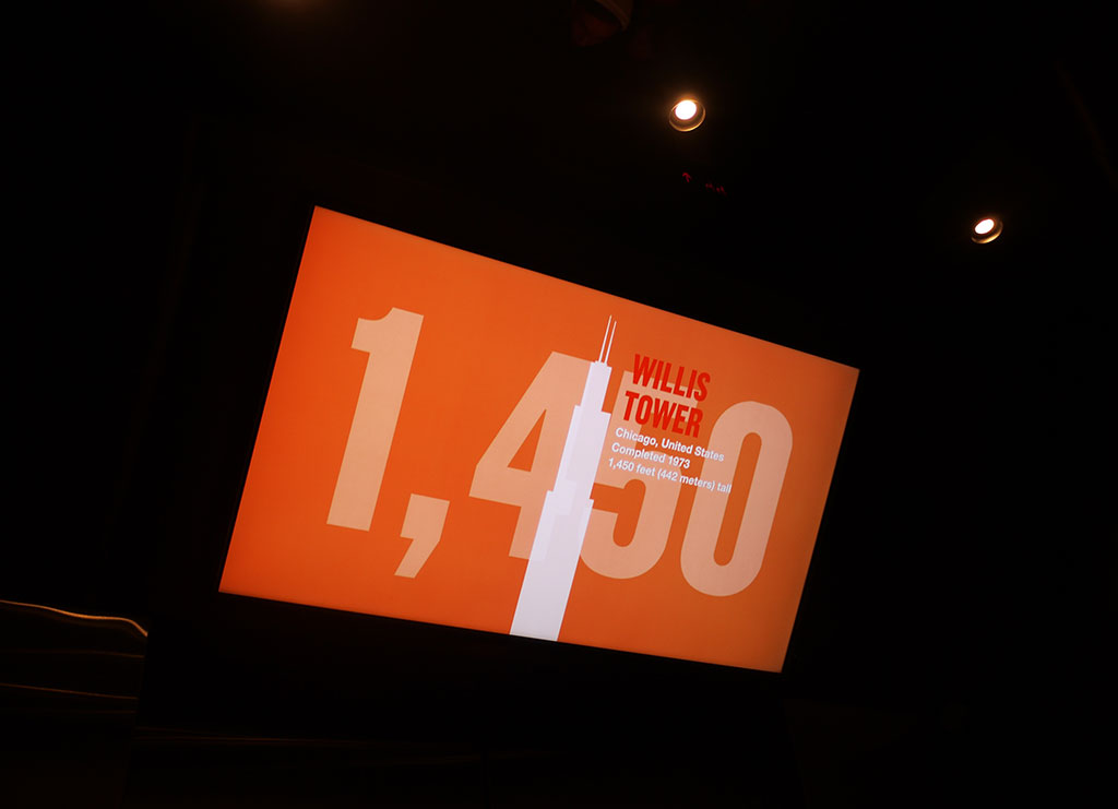 At the Skydeck, you ride the elevator and go up 442 meters. The screen inside the elevator shows you how far up you are getting, for instance “this is how high the Eiffel Tower is, folks,” and as much as it’s helpful, it’s a little terrifying when you actually think about it. So all in all, good job.