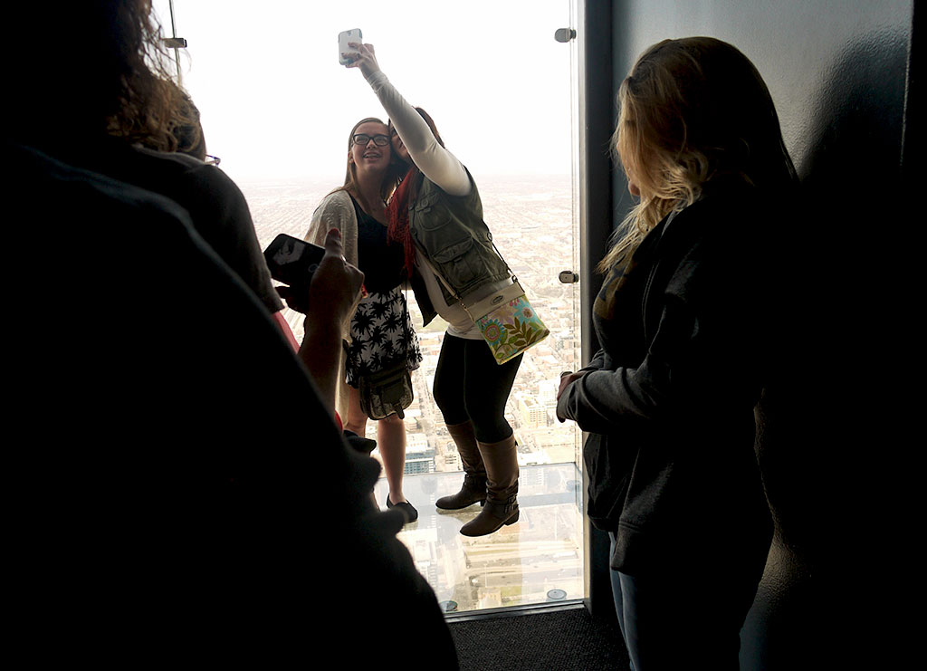 라운지에 올라가려면 미성년자인지 확인을 해줘야하는데 너무 버젓이 30대 중반인 사람도 100% 보여줘야한다. 기본 칵테일을 시키고 수다를 떨기 시작…하기도 전에 모든 사람들이 창문에 붙어 사진 찍기 시작. 중요한 팁은 여자 화장실의창문이 훨씬 크고 전망도 좋아서 화장실 간 여자들이 볼일보고 다들 셀카 삼매경이 된다는 것. 대신 안타깝게도 남자 화장실에는 이런 창문이 없다. 어떤 여자들은 화장실안에 있는 다른 여자들에게 양해를 구한 뒤 남편이나 남자친구를 데리고 들어와 사진을 찍기도 한다고.